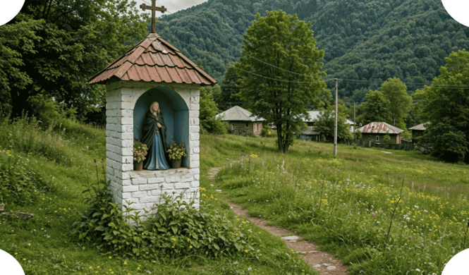 Wieś Omalo w Gruzji. Pamiątkowa kapliczka na cześć zielarki Manany.